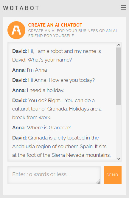 Start Building Your Travel Chatbot >Your travel chatbot can talk to your customers about vacations and adventures and all types of hotel bookings and holiday rentals. It can answer all your traveler queries and take bookings. We can help you set up your AI travel agent and customise it for your travel business. You can install our travel AI in your own website or you can create a free travel chatbot on Wotabot, like the demo below: