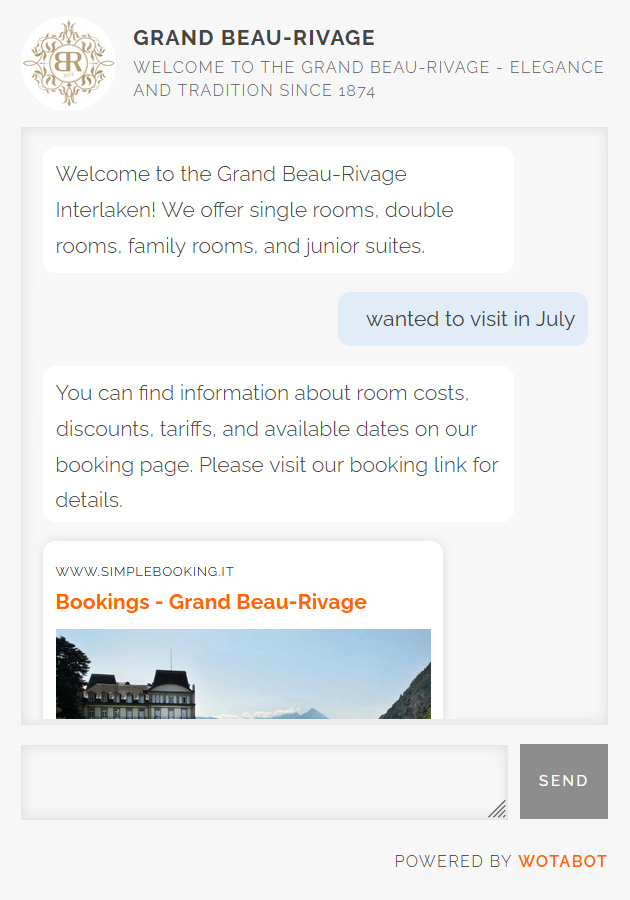 Your bed and breakfast chatbot can talk to your guests about your property and offer them booking options. It can answer all your traveler queries and show them images of your rooms and tell them about activities nearby. You can install your B&B AI in your own website or you can create a free bed and breakfast chatbot on Wotabot like the demo below: